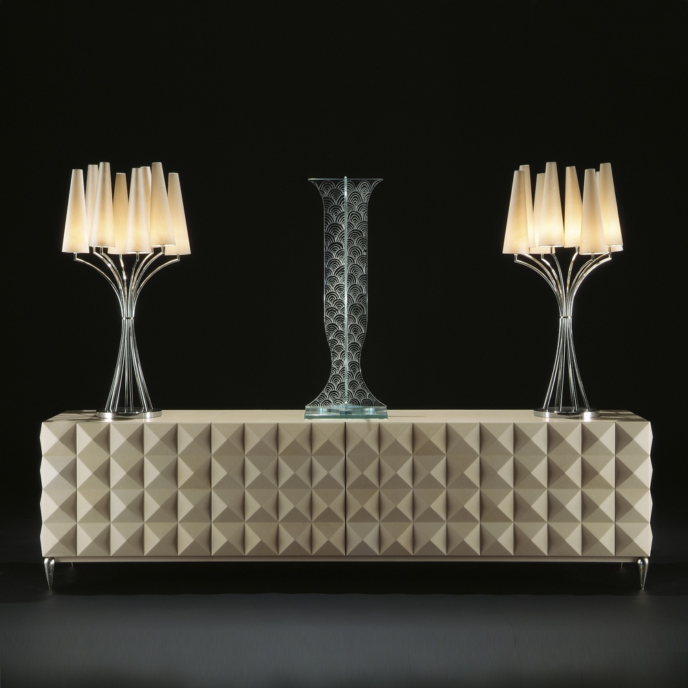 Stand from Italian manufacturer Tura. The case is natural wood. Mosaic handmade. Base - metal. The finish is a high - tech parchment (thin leather of a special tannage). The model is made in a modern style, combines tradition and design. Colours in stock.