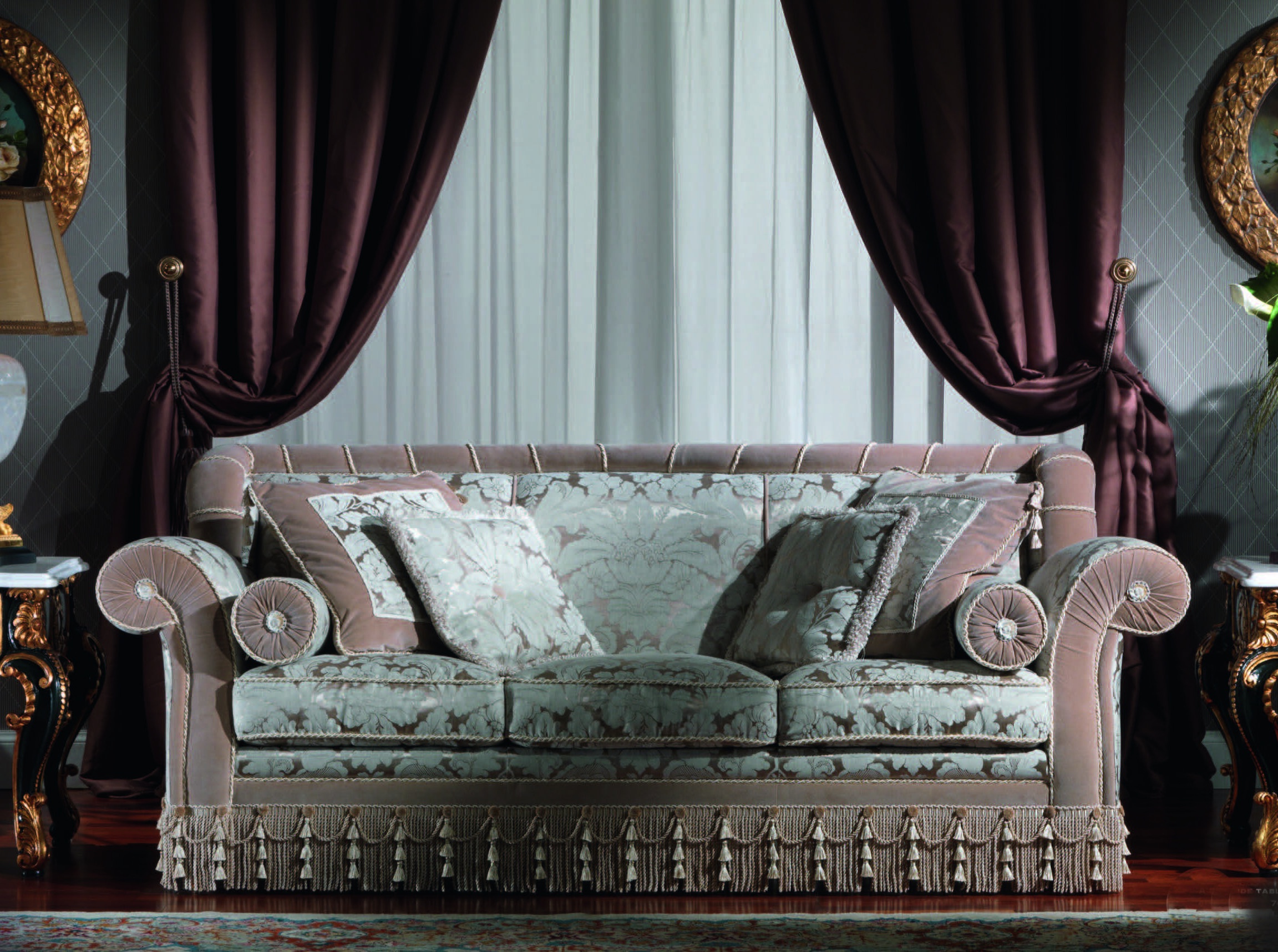Three seater sofa from Italian manufacturer Armando Rho. Model in classic style, made of solid wood. The finishing - varnish. Upholstery - textiles from a range of companies, the filler - the pen. Colours in stock.