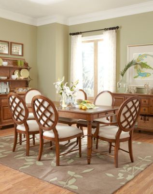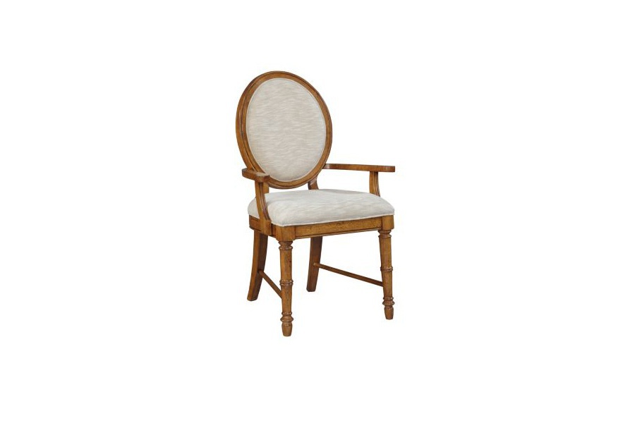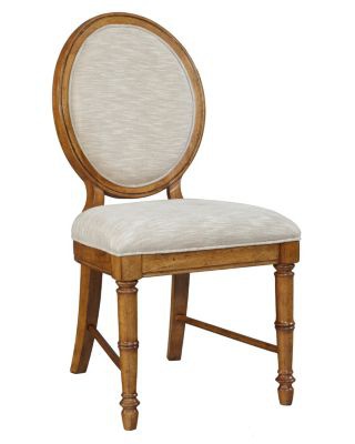 Samana dining chair from American Furniture manufacturer Broyhill. Designer dining chair is made in a tropical style, this is a good option for a country house or a large terrace. The chair is made of wood with carved simulate bamboo legs. Upholstered seat, upholstered back oval back decorated with a geometric pattern of bamboo veneer. Textile mimics rattan weave. Available in two versions: with armrests or without them. For chair without armrests provide vertical extension.