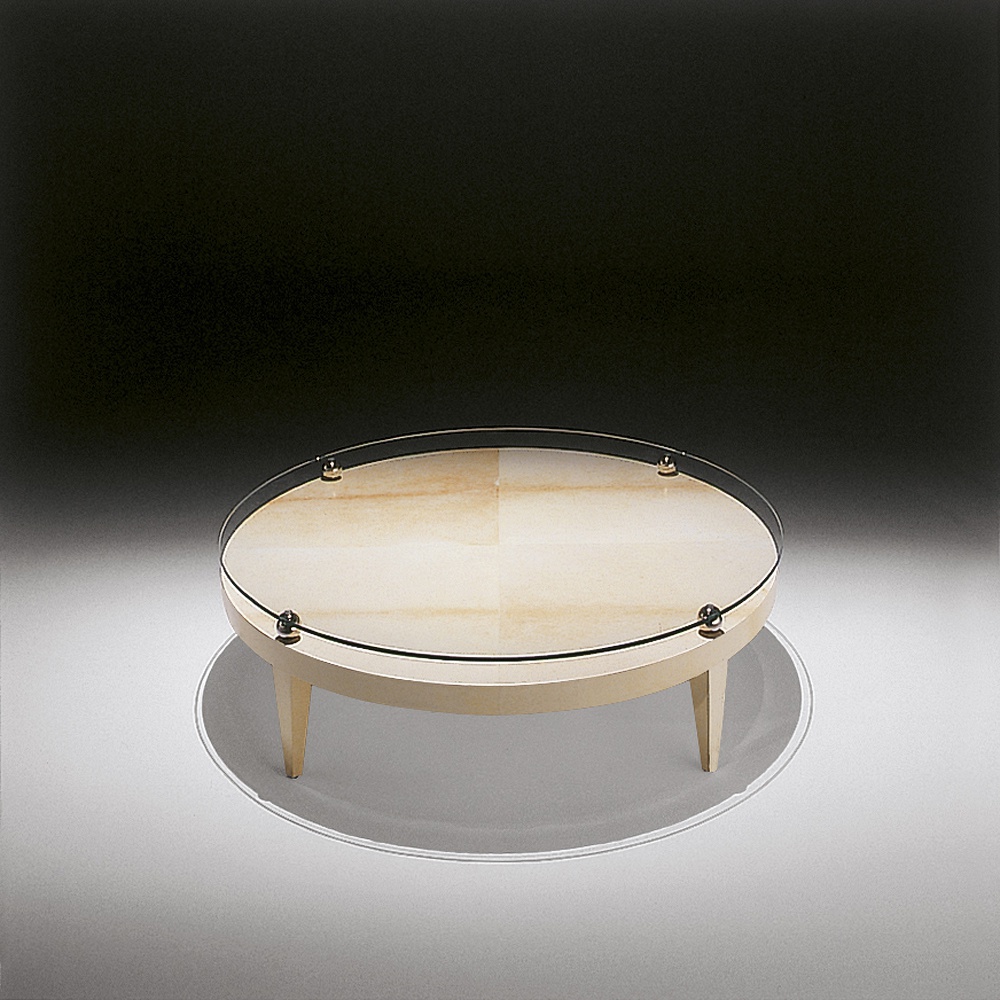 Coffee table from the Italian manufacturer Tura. The frame is natural wood. Worktop - glass. The finish is a high - tech parchment (thin leather of a special tannage). The model is made in a modern style, combines tradition and design. Colours in stock.