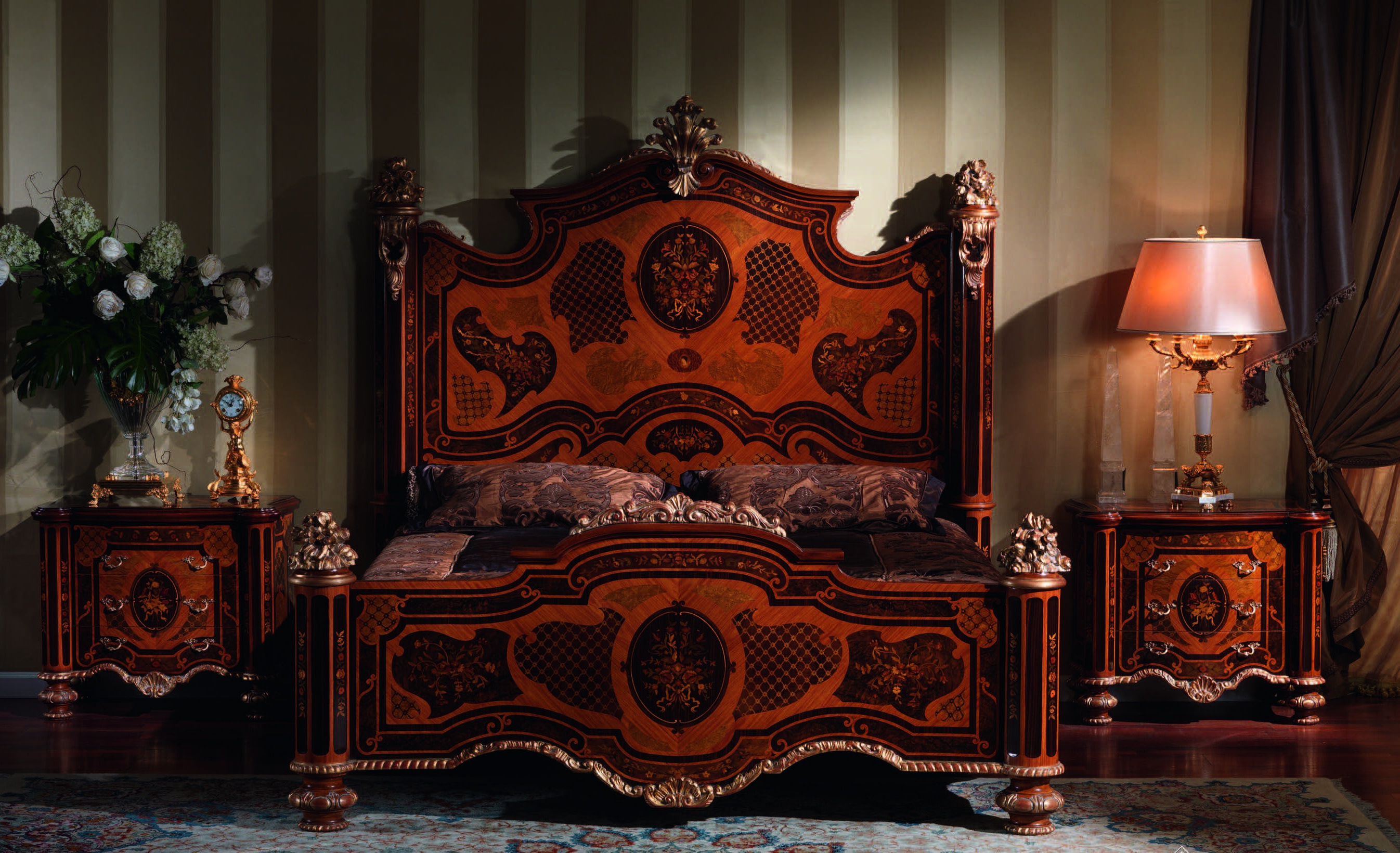 Double bed from Italian manufacturer Armando Rho. Model in classic style, made from solid wood inlaid with combinations of several types of wood. The hand-carved finish lacquer, gold leaf. Colours in stock.