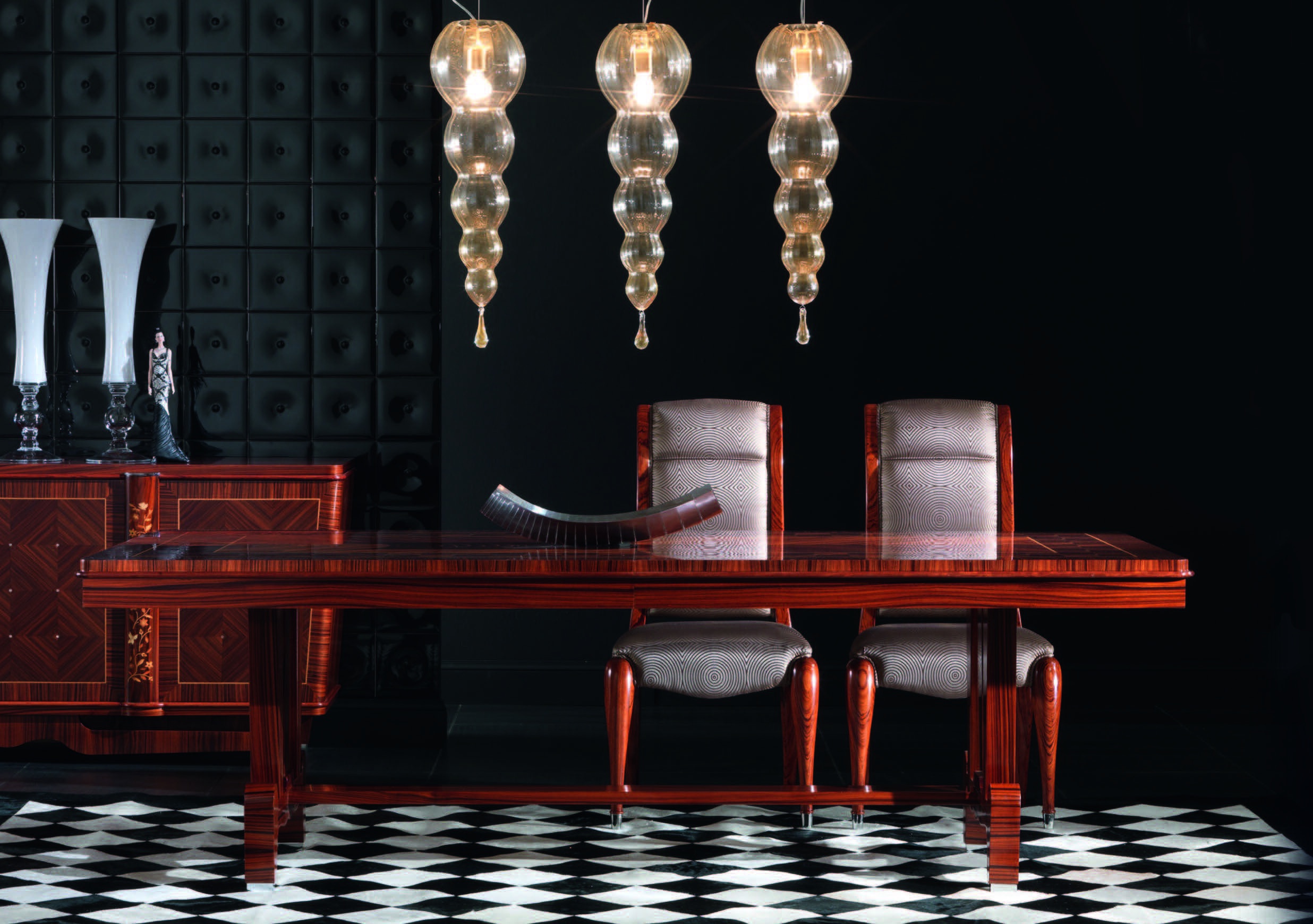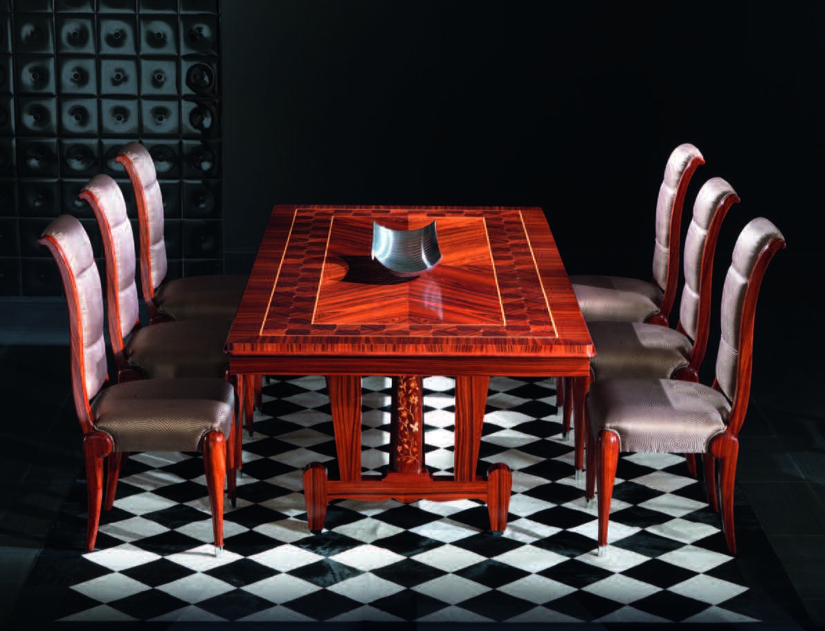 Folding dining table from Italian producer Armando Rho. The model is made from solid wood inlaid with combinations of several types of wood. Carving handmade. Colours in stock.