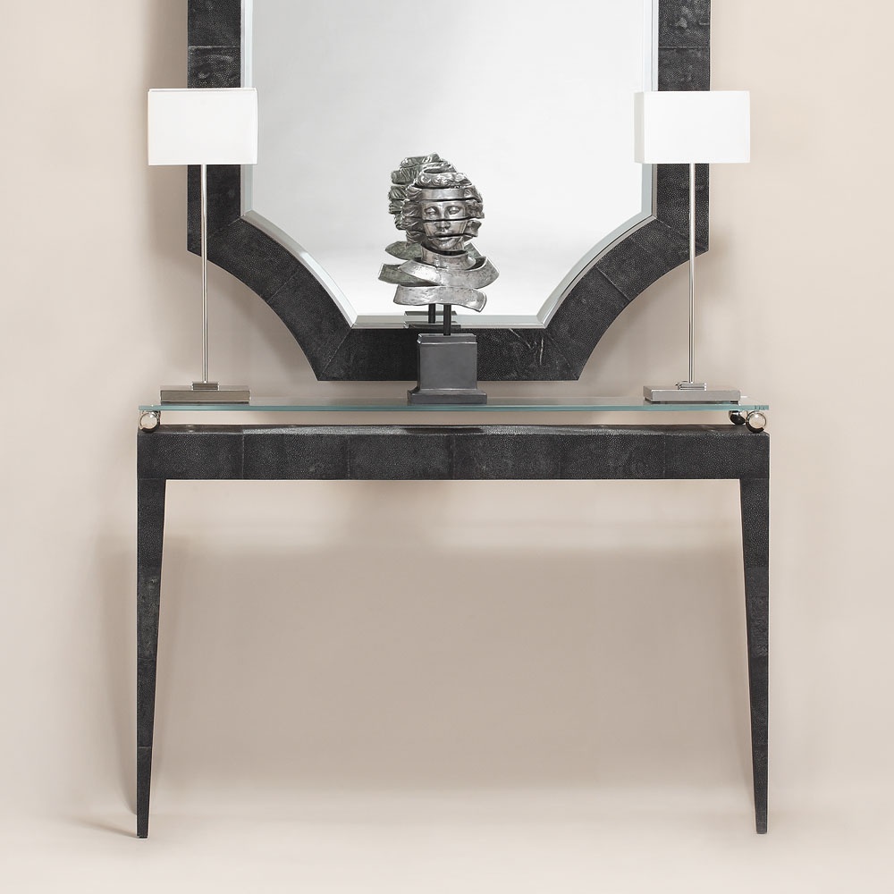 Console Galuchat from the Italian manufacturer Tura. The frame is natural wood. Worktop - glass. The finish is a high - tech parchment (thin leather of a special tannage). The model is made in a modern style, combines tradition and design. Colours in stock.