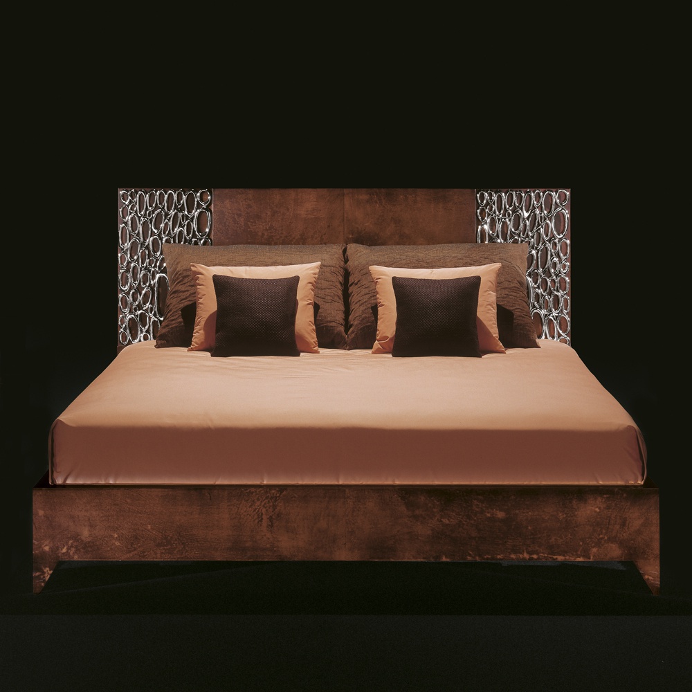 Double bed Scultura from the Italian manufacturer Tura. The frame is natural wood. Decorative elements - polished Nickel. The finish is a high - tech parchment (thin leather of a special tannage). The model is made in a modern style, combines tradition and design. Colours in stock.