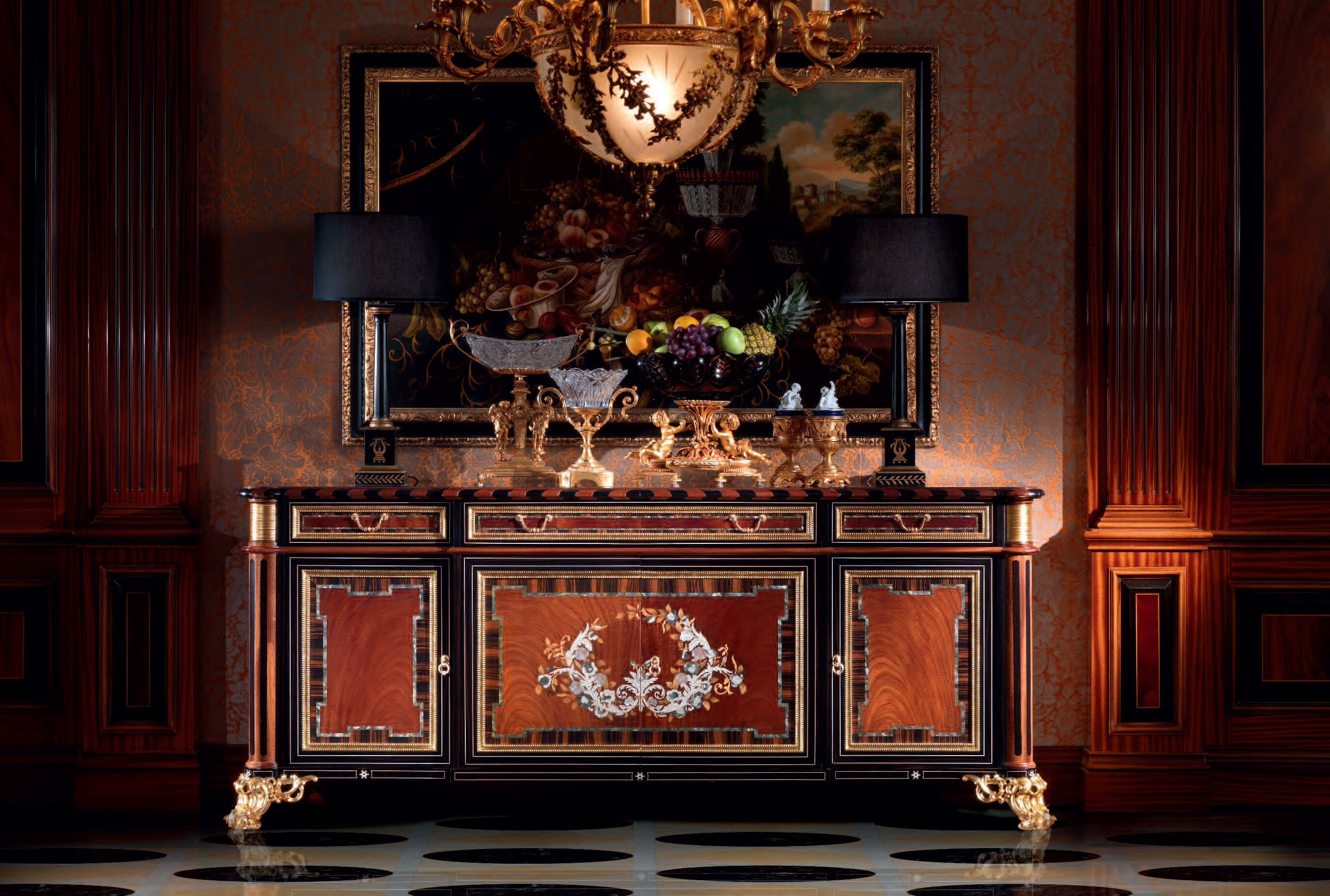 Sideboard from Italian producer Armando Rho. The model in the Empire style, made of solid mahogany and ebony richly carved handmade finished off in gold leaf. Beautiful decorative pattern of several types of wood, ivory and pearl white. Insert elegant and exquisite detail of natural stone and marquetry (wood inlay).