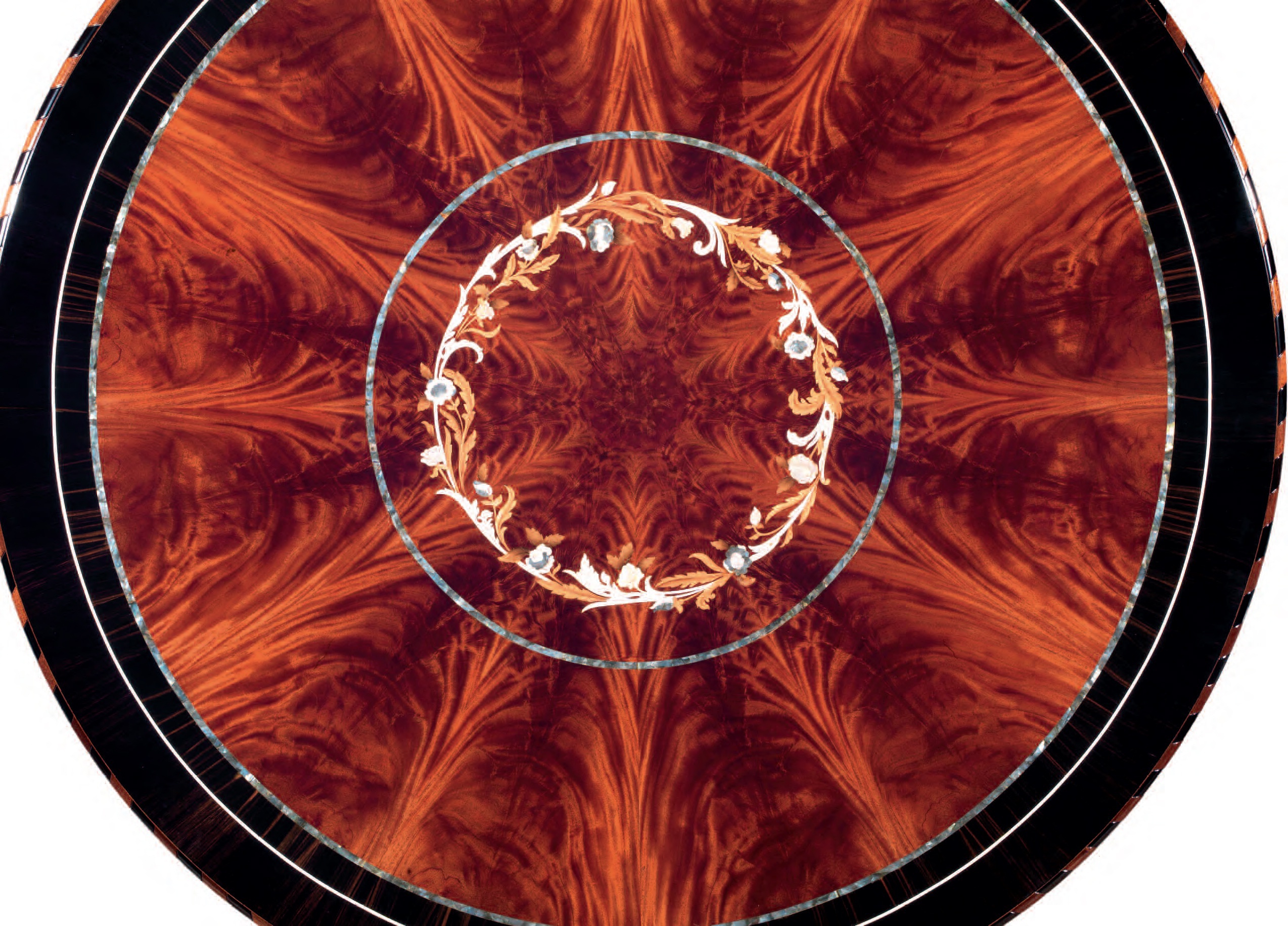 Round dining table from Italian producer Armando Rho. The model in the Empire style, made of solid mahogany and ebony richly carved handmade finished off in gold leaf. Beautiful decorative pattern of several types of wood, ivory and pearl white. Insert elegant and exquisite detail of natural stone and marquetry (wood inlay).
