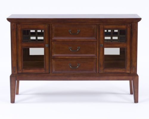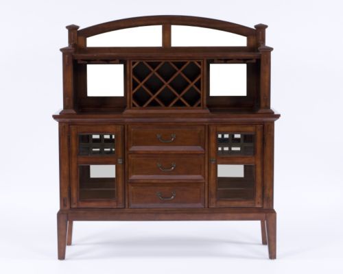 The buffet Vantana from the American manufacturer Broyhill Furniture. Designer sideboard, consisting of two parts, can be used as a complete and in parts. This original sideboard will adorn any interior living room or dining room. The sideboard is made of wood with multi-stage finish that beautifies and protects the product, color range Golden brown. The product is lacquered to ensure long-lasting service. The base part represents a low sideboard with three drawers for silverware and linen and two swing doors, behind which two separate compartments for utensils with light and glass shelves. The grooves of the drawers for easy glide waxed. Top server demo includes two open shelves for cookware and secondary storage compartment for bottles. The rear panel is secured with screws, corner blocks reinforced, there is stall protection.
