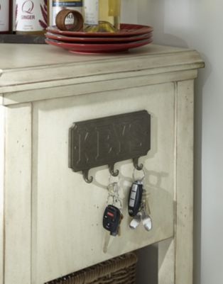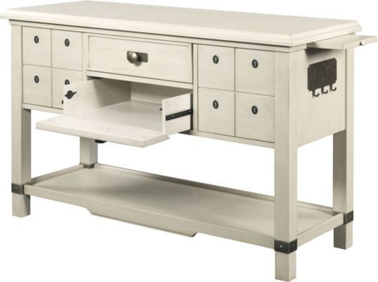 The New Vintage sideboard from the American manufacturer Broyhill Furniture. Small sideboard credenza, made in vintage style, thanks to its dimensions can be used not only in the dining room, but in the kitchen. The sideboard is made of wood with multi-stage finish that beautifies and protects the product, the colours are milky white. The product is lacquered to ensure long-lasting service, and is a low sideboard with a pull-out silverware drawer, pull-out tray and eight boxes of stuff. At the bottom is a shelf for dishes, on the side there is a sliding Board and key rack. Finish and metal fittings.