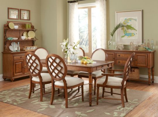 A snack in Samana from the American manufacturer Broyhill Furniture. Sideboard credenza, designed in a tropical style, it would be appropriate in a country house and in the dining room of a city apartment. The sideboard is made of wood with multi-stage finish that beautifies and protects the product, in warm Golden brown tones of cognac. The product is lacquered to ensure long-lasting service. The upper part has two drawers for silverware and linen and two compartments for dishes with hinged doors, decorated with wicker rattan. Carved legs simulate bamboo, between them strengthened shelf with glazed geometric pattern. Top made of stone, brass fittings.