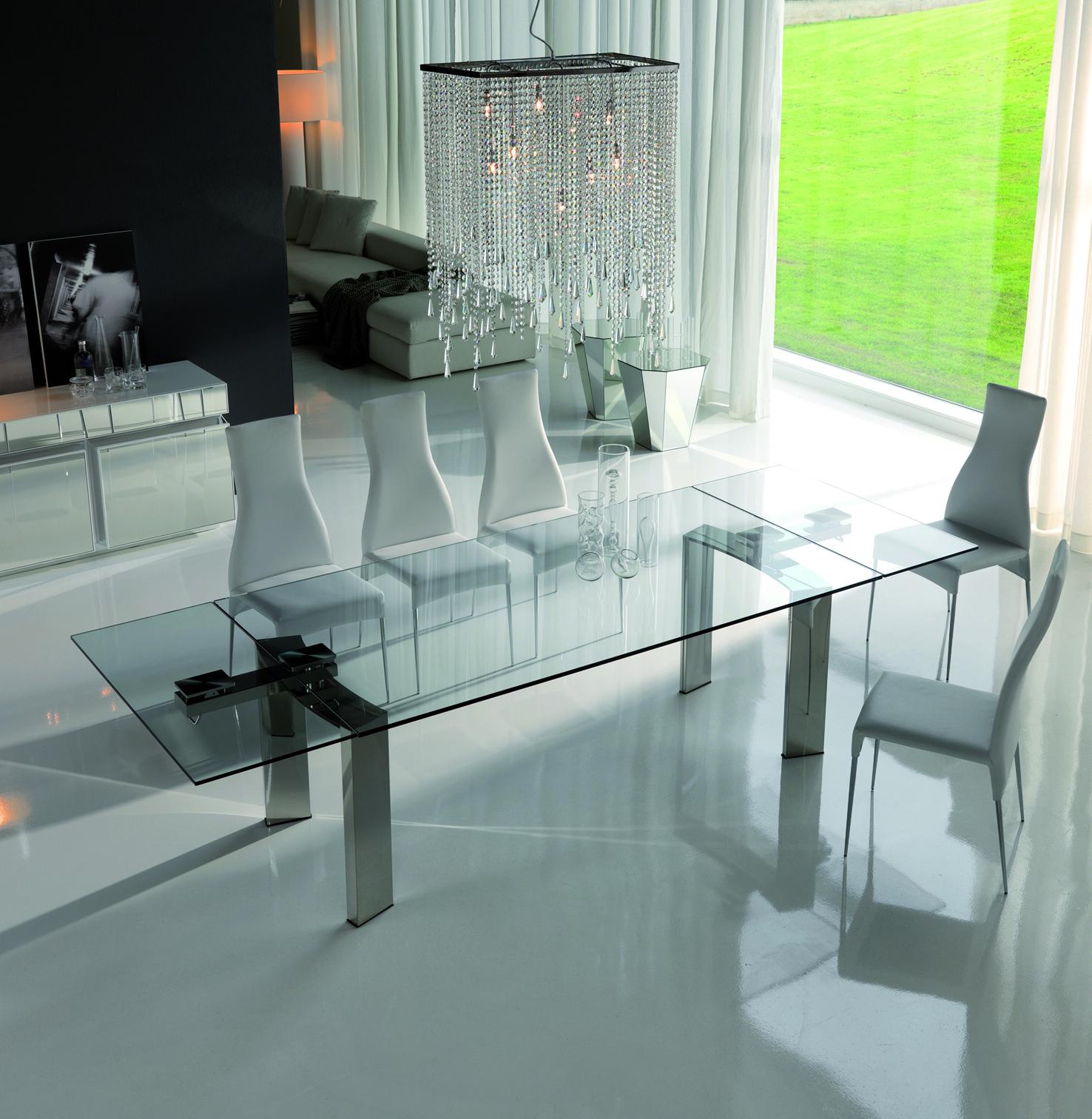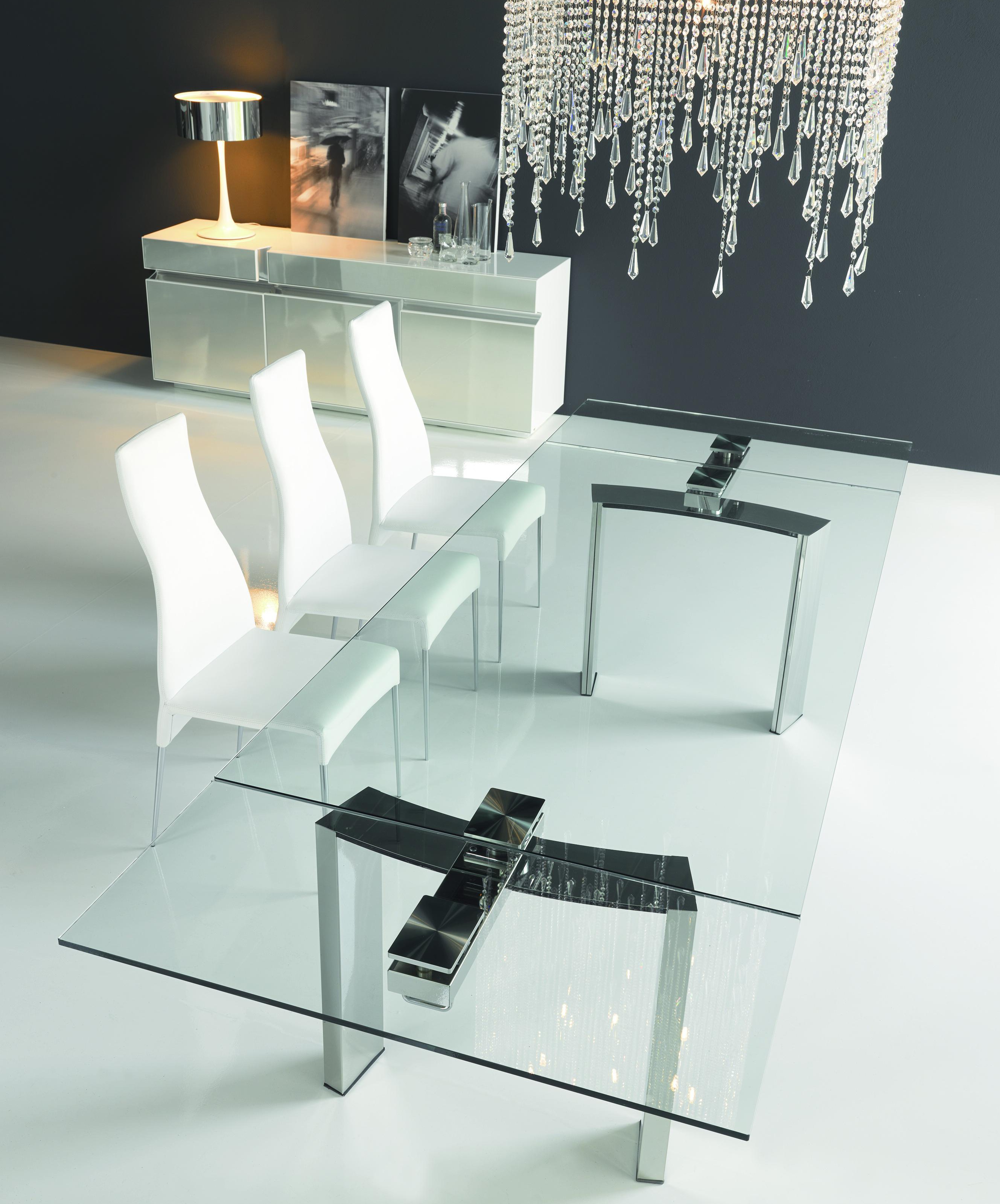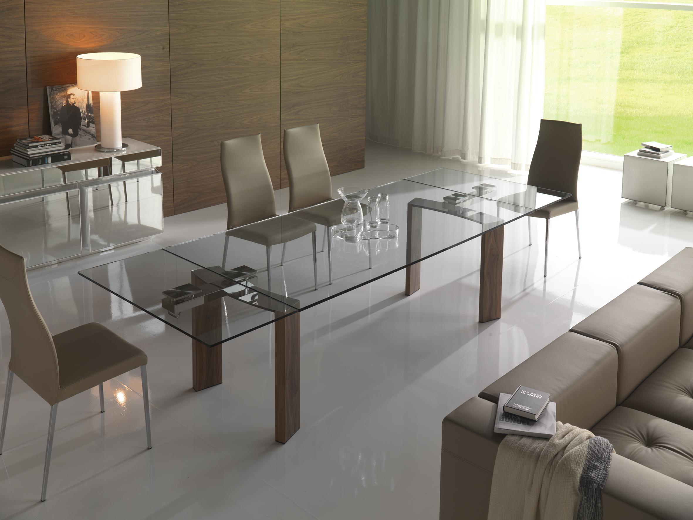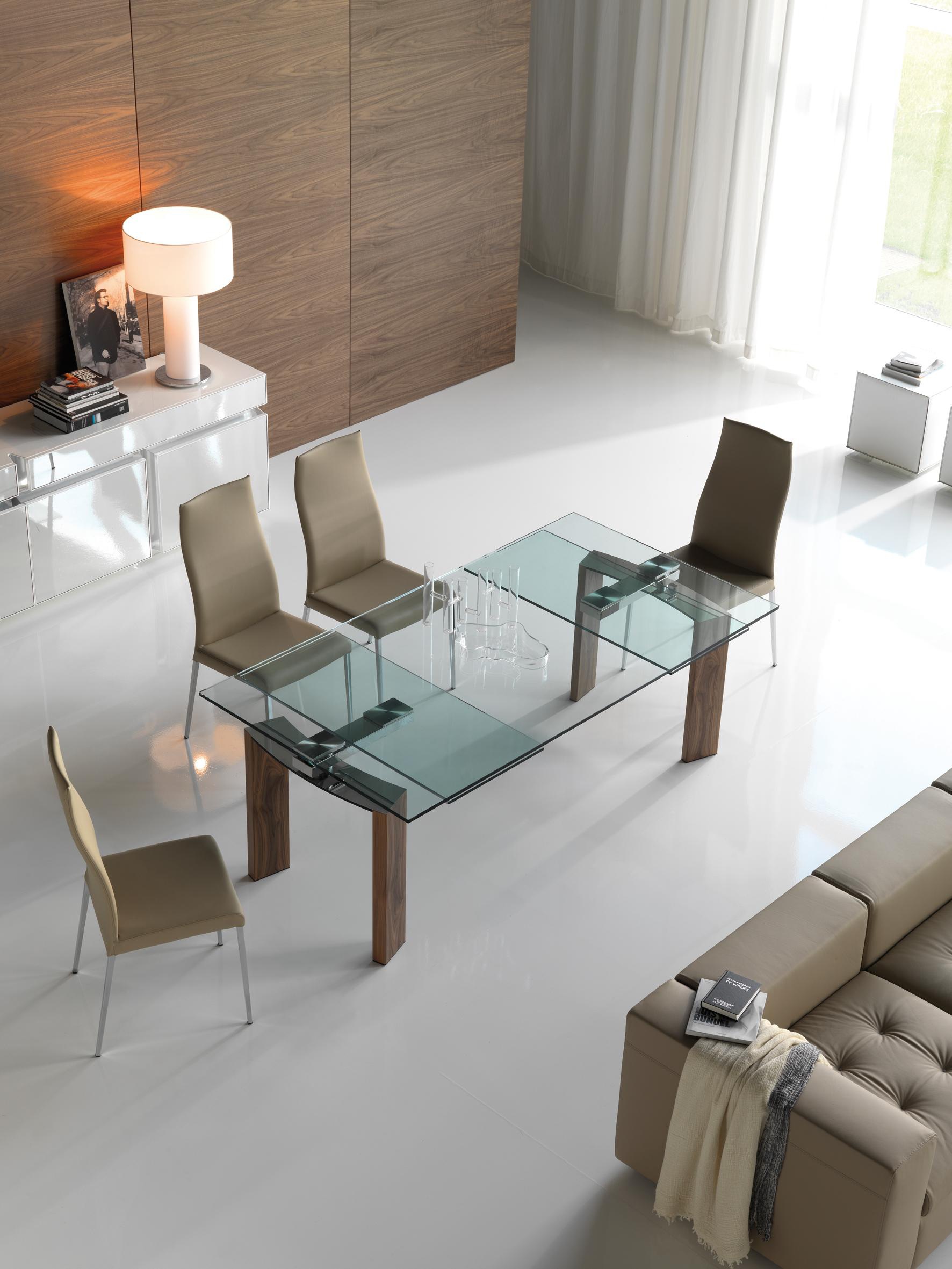 Daytona dining table from Italian manufacturer Cattelan Italia. The table top is made from tempered transparent glass. Legs and sliding mechanism vyplneni of steel and wood. The model is made in a modern rectangular style. Colours in stock.
