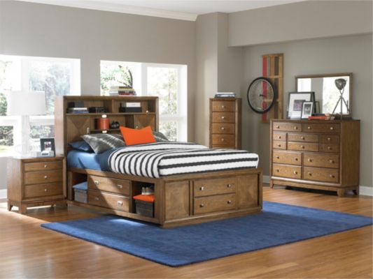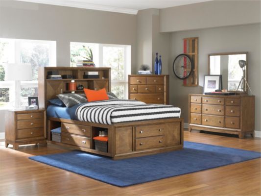 Bed Meramac from the American manufacturer Broyhill Furniture. The model offers spacious modern organization of Your bedroom. Double bed a modern silhouette made from wood and finished with rich medium brown color. The headboard is completed with shelves and drawers that can be used as a library or for placement of audio equipment. The rear wall has a slot for communication wires. At the base of the bed also has multiple drawers and open shelves for storing clothes and shoes. The bed is available in two sizes - king and Queen. Selection of components of elements and their sizes is at the request of the customer.