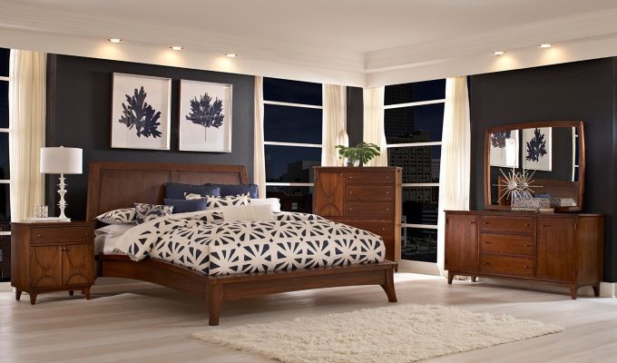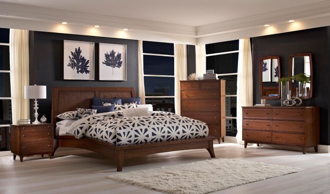 Bed Mardella from the American manufacturer Broyhill Furniture. Double bed platform, made in a modern style and will adorn any bedroom. Made from wood and finished in walnut veneer in a warm cognac tones. The legs are tapered and slightly splayed; the head is decorated with two panels. The arched profile of the bed gives it a lightness and a floating look. The bed is available in two sizes - king and Queen. Selection of components of elements and their sizes is at the request of the customer.