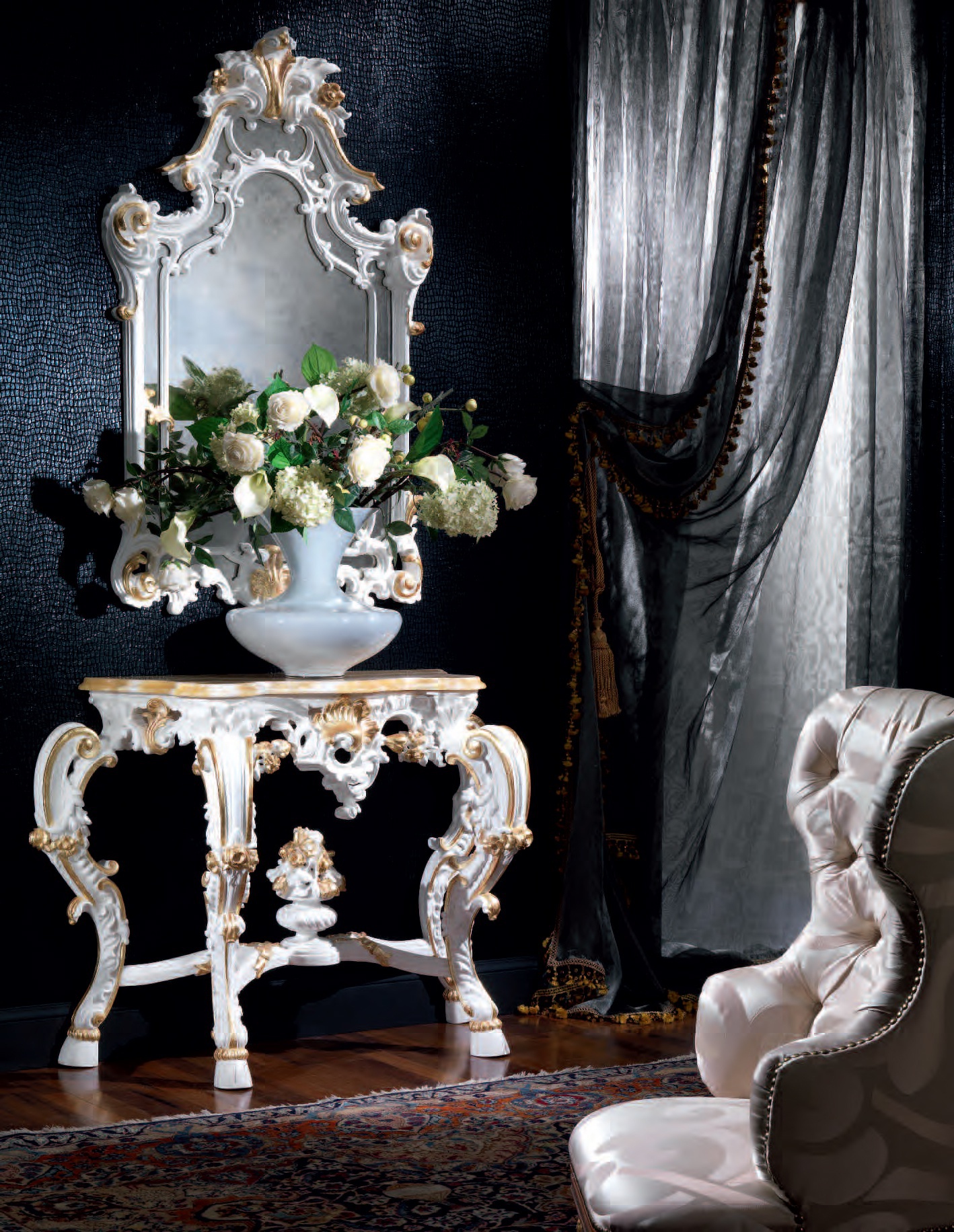 Console from the Italian producer Armando Rho. The model in the Baroque style, made of solid wood richly carved handmade finished off in gold leaf. Countertop - marble.
