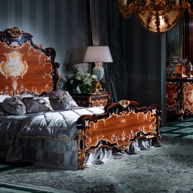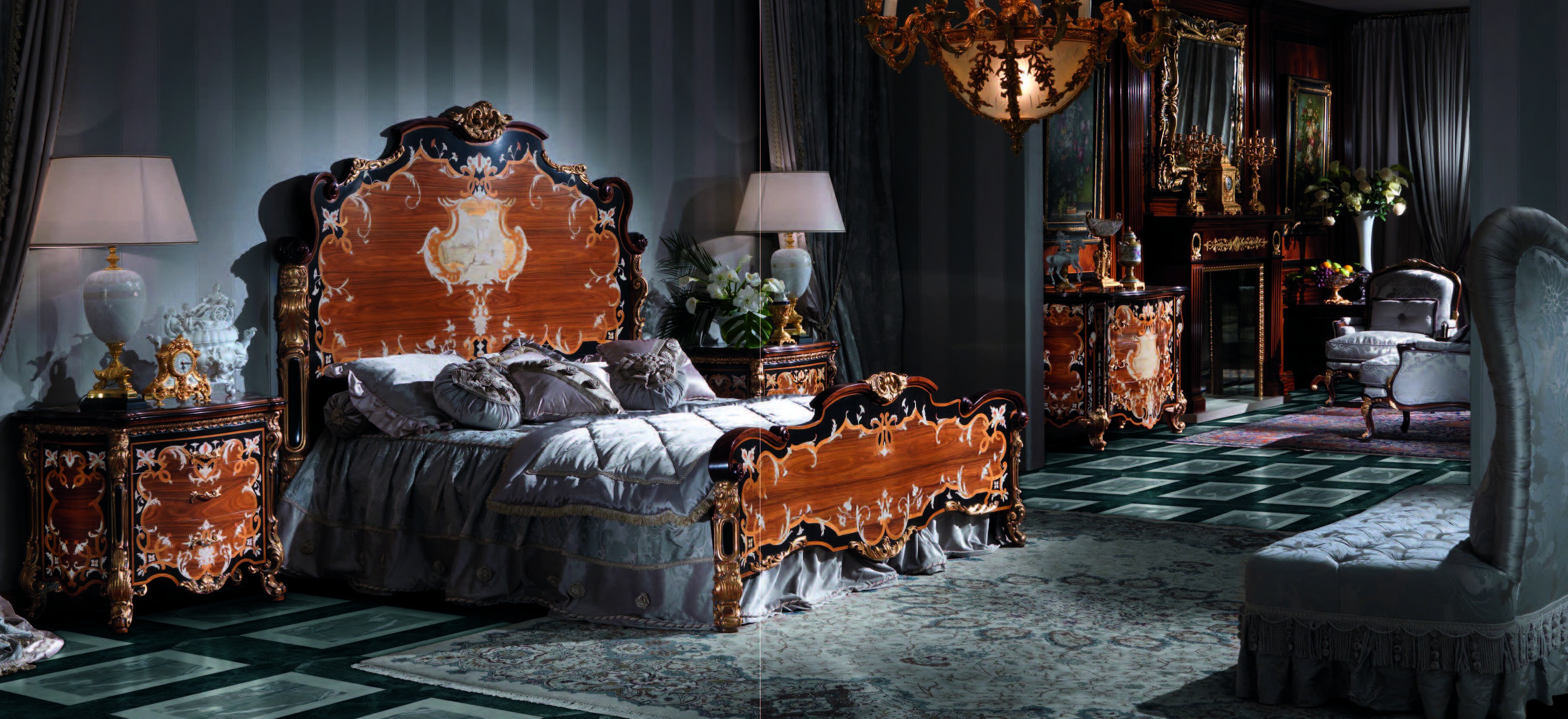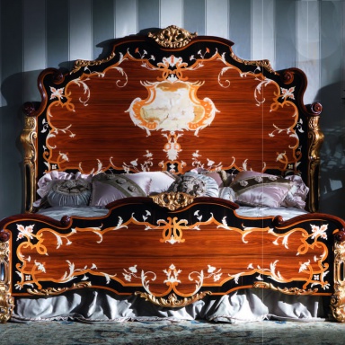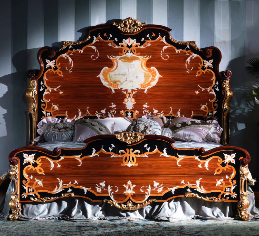 Double bed from Italian manufacturer Armando Rho. The model in the Empire style, made from solid dark wood, richly carved handmade finished off in gold leaf. Beautiful decorative pattern of several types of wood, ivory and pearl white.