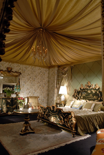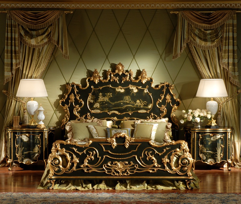 Double bed from Italian manufacturer Armando Rho. Model in classic style, made from solid dark wood, richly carved handmade finished off in gold leaf. Beautiful decorative pattern of several types of wood, ivory and pearl white. Insert elegant and exquisite detail of natural stone and marquetry (wood inlay).