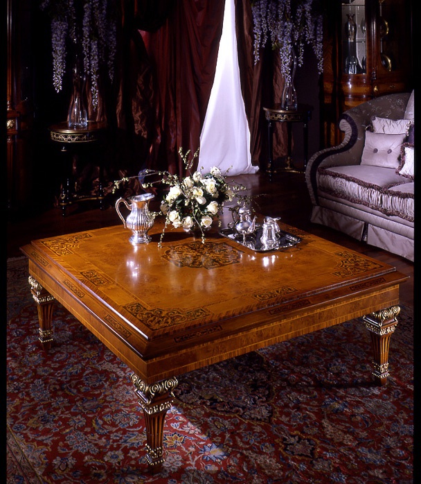 Coffee table from the Italian manufacturer Armando Rho. The model is in classic style solid wood richly carved handmade finished off in gold leaf. Beautiful decorative pattern of several types of wood.