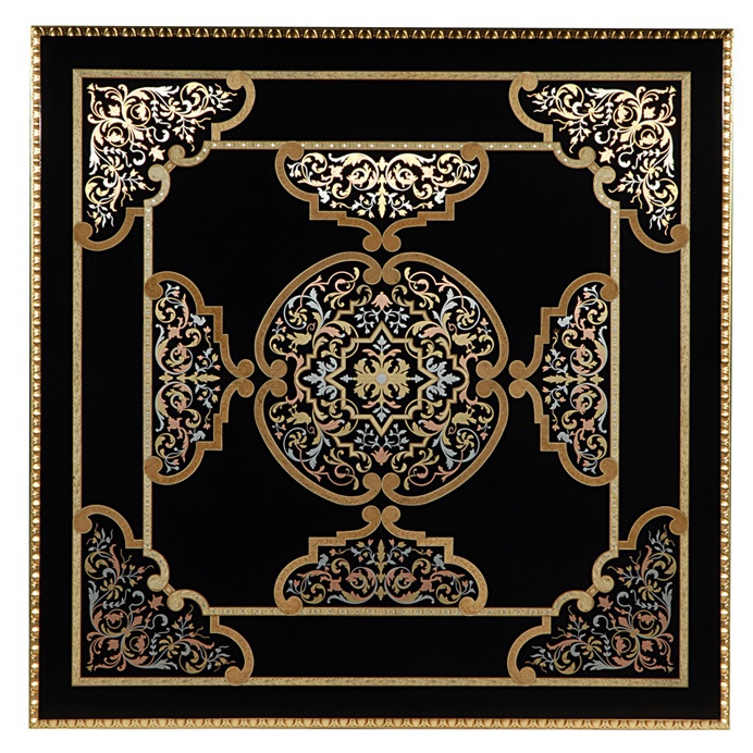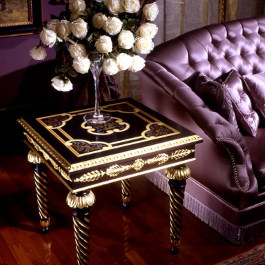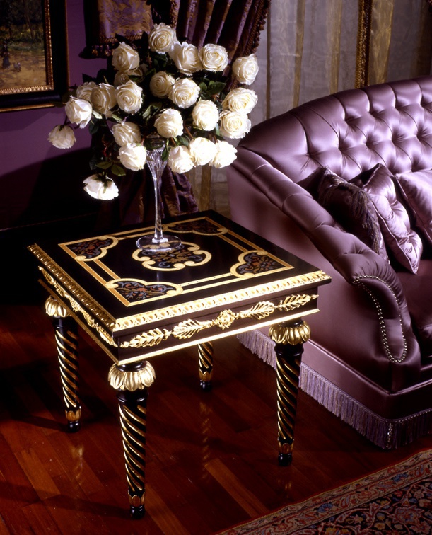 Coffee table from the Italian manufacturer Armando Rho. Model in the classic style from solid wood. Richly decorated with hand carved. Finishing with gold leaf. Beautiful decorative pattern of several types of wood.