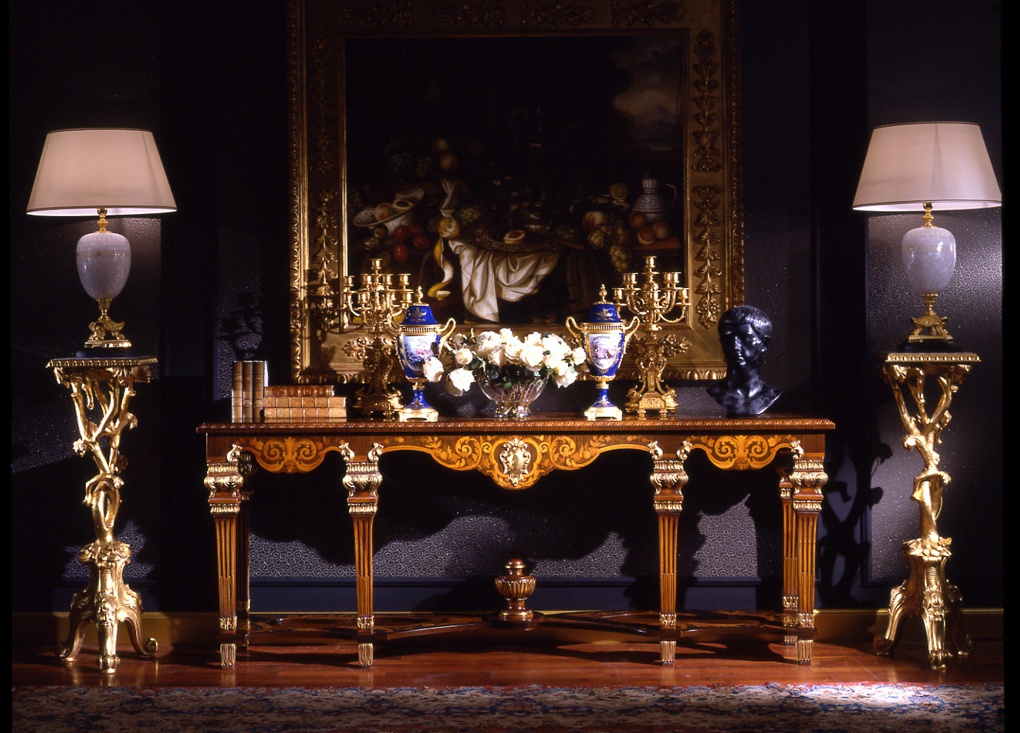 Console from the Italian producer Armando Rho. Model in the classic style from solid wood. Richly decorated with hand carved. Finishing with gold leaf. Beautiful decorative pattern of several types of wood. Colours in stock.