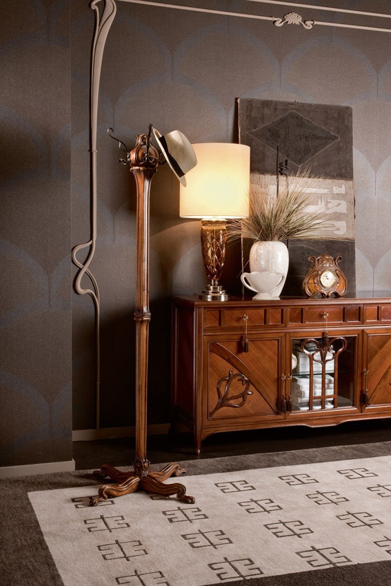 Hanger Liberty from the Italian manufacturer Medea. Floor model hangers. Prop is made of wood and decorated with carvings. Finishing made with lacquer. Hooks made of metal.