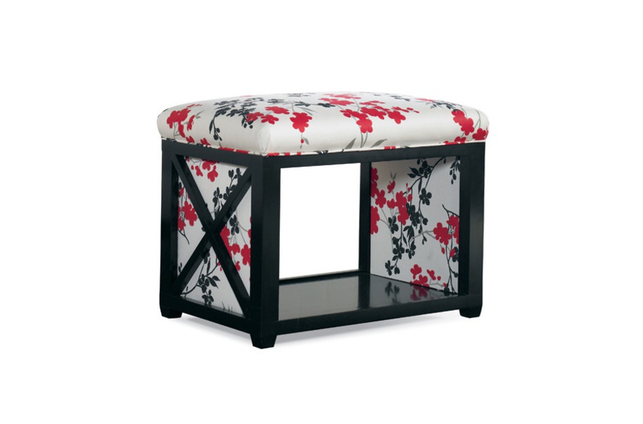 Poof from the American manufacturer Sherrill Furniture. Made in the Chinese style, this soft pouf bench will create a bright spot and will look in Your living room, bedroom or dining room. Frame, legs and a crossbar in the form of shelves made of wood and covered with black lacquer; the sides decorated with oblique crosses. The seat and sides upholstered in fabric with a pattern in bright red and white colours, typical of the chinoiserie interiors. The pouf can be used as bedside, in the dressing room or the lobby, and to give our feet a rest. By constantly improving furniture company Sherrill Furniture for more than fifty years has been a leader in the manufacture of quality products for the home.