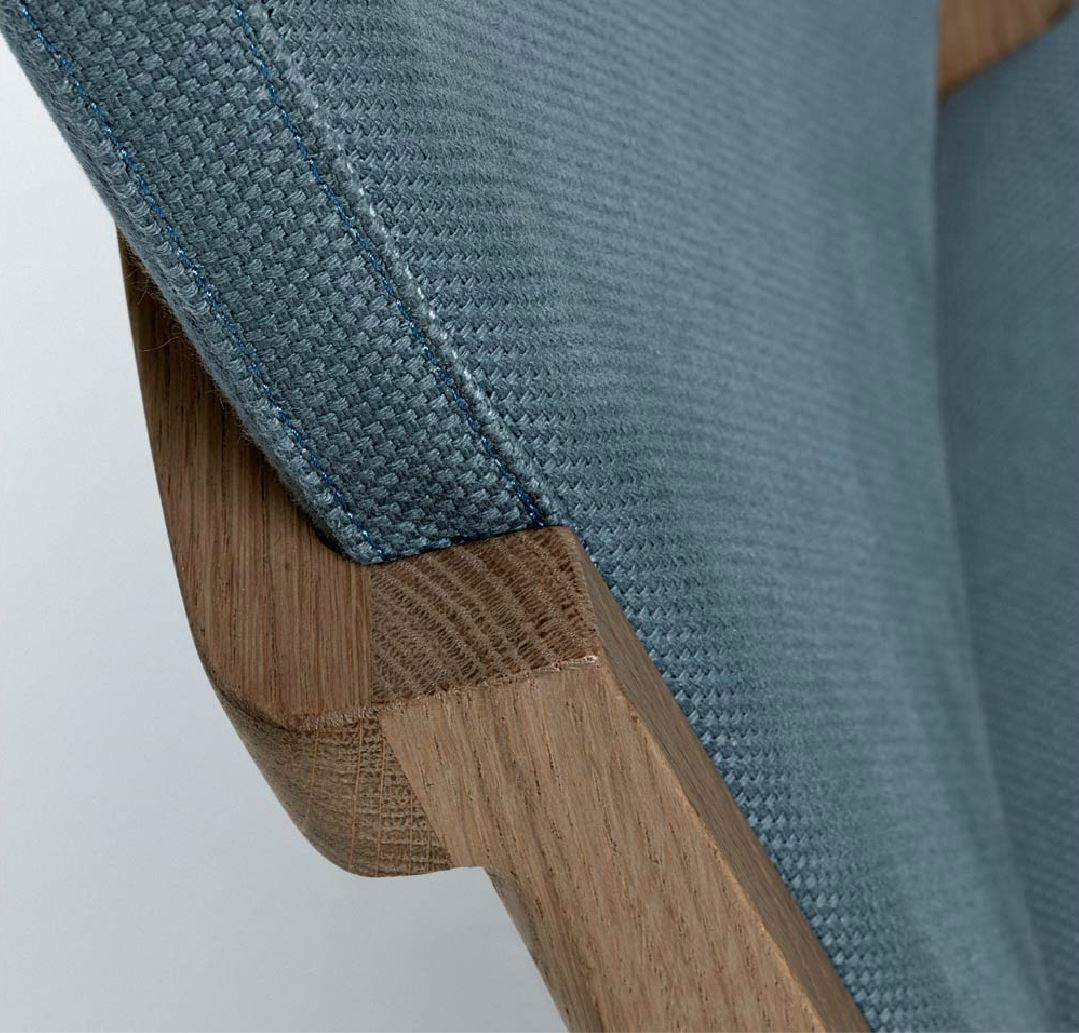 Chair Peak from Italian manufacturer MisuraEmme. The product is made from solid oak. Available finishing materials : Matt lacquer, walnut veneer or oak melange. Upholstery - textiles. Color is back in stock. The style is modern, perfect choice for a stylish dining room and living room.