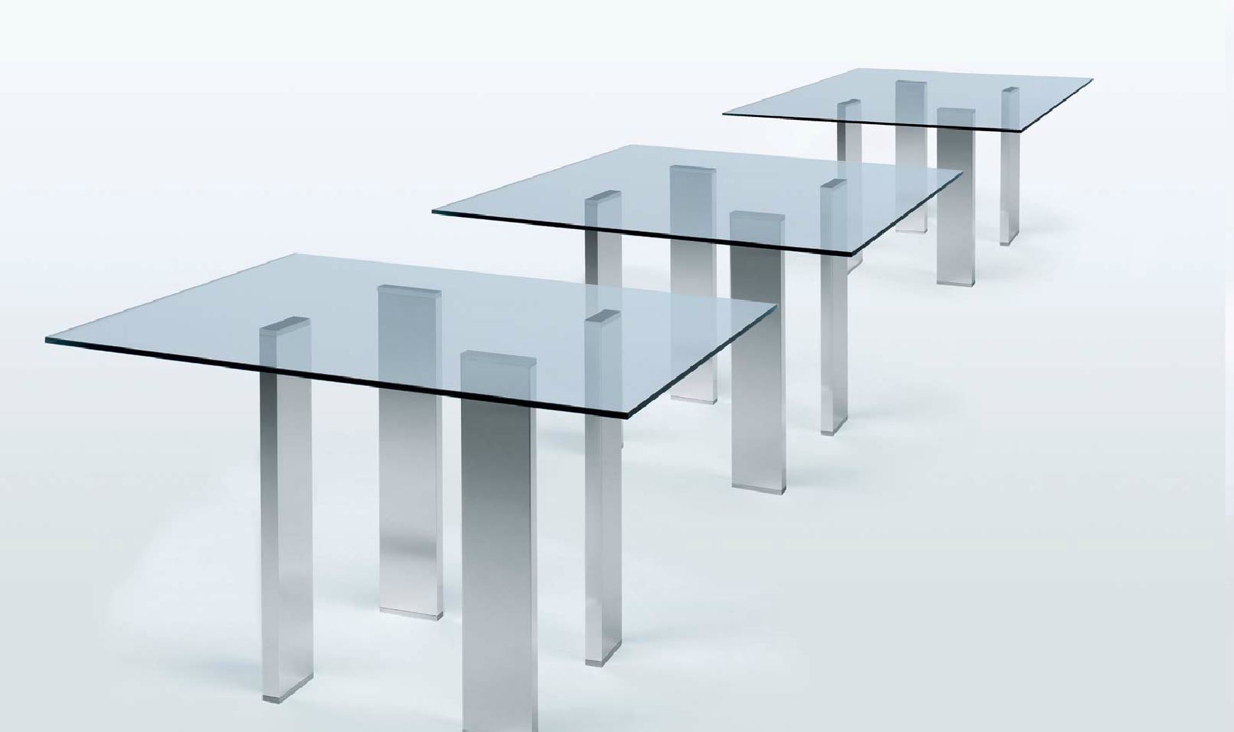 Taul dining table from Italian manufacturer MisuraEmme. Square table top made of tempered clear/tinted glass. The legs are available in polished aluminum, dark steel, finish walnut or Matt lacquer finish. The style is modern. Harmoniously fit into the interior of a modern dining room. Available also with model rectangular and oval shapes of the table tops.