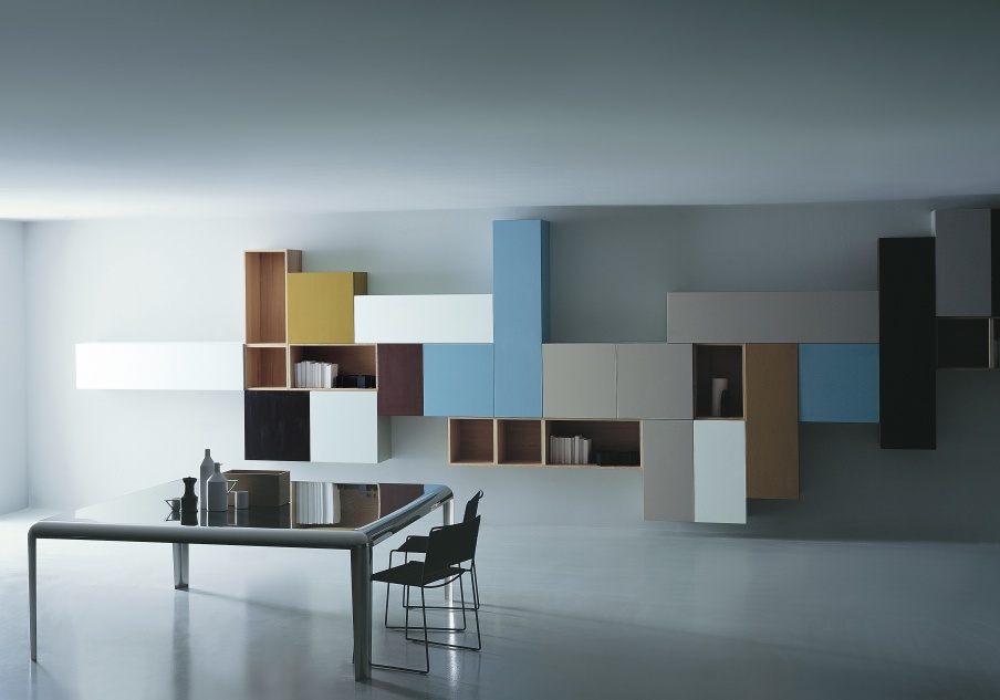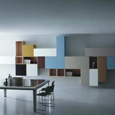 Storage system HT Work from the Italian manufacturer Porro. Modular storage system geometry. Available different materials and finish options. The modules differ in shape and purpose, painted in different colors. In 2008 the system was enhanced with new solutions. Aesthetic and technical characteristics have been combined in a composition, consisting of a floor module with hinged doors (for DVD and VCR equipment, decoder) and wall module with one sliding door, behind which you can hide TV. Also available wall elements from solid untreated Hemlock (North-American wood with a clear veins and a white-yellow tint) with hand-painted doors.
