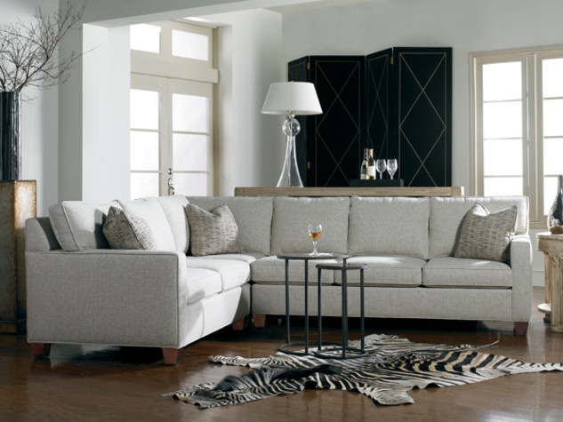 Sofa sectional from American Furniture manufacturer Sherrill. This model is designed in a modern style and includes a double sofa, a triple sofa and a corner chair. The frame and legs are made of sustainable wood, textile upholstery, colour grey melange. The seat cushion and backrest with extra volume stitched on a contour. The standard model supplemented by three removable cushions. By constantly improving furniture company Sherrill Furniture for more than fifty years has been a leader in the manufacture of quality products for the home.