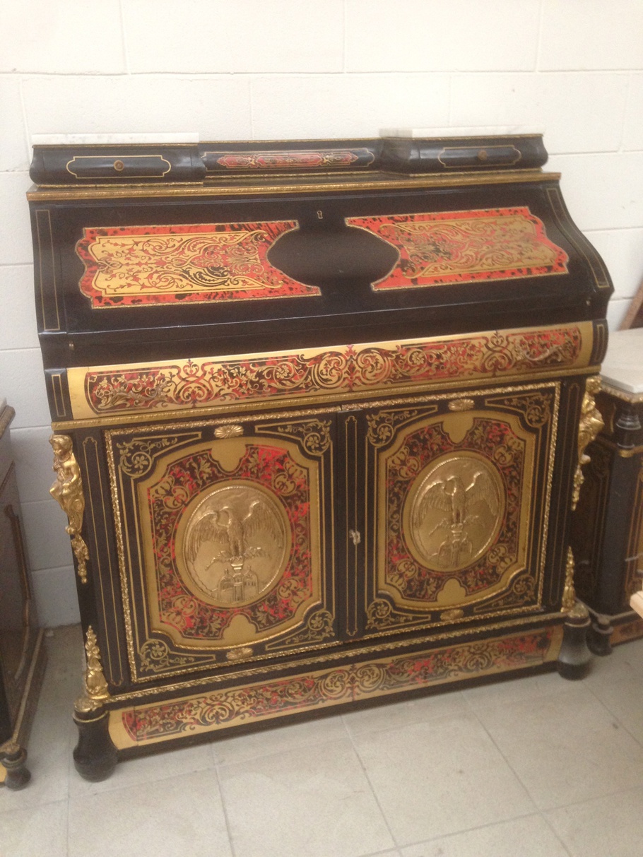 Boulle secretaire from the Italian manufacturer Marconi Arte. Piece instance intended for exhibition. The frame is made of wood. Finish: lacquer, gold leaf, hand made sculpture bronze, inlaid turtle. Finish same as picture.