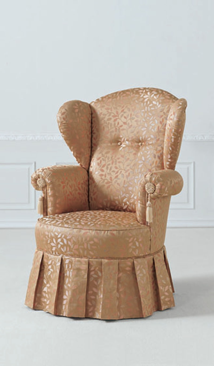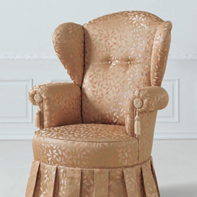 The high-backed chair Micky from the Italian manufacturer Mobilsedia. Model with a high back and rounded armrests. The base is hidden by a decorative skirt. The frame is wooden. Upholstery textile for the company directory. Filler - polyurethane foam. The perfect solution for the interior in classic style.