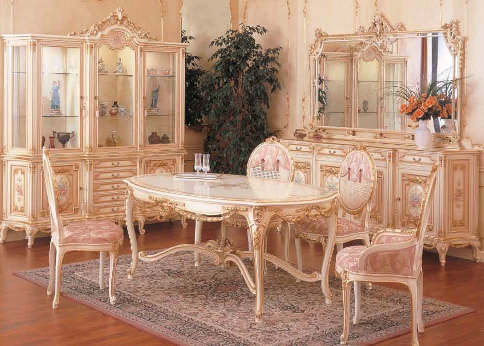 Set for the dining room by Italian manufacturer Fratelli Radice. Oval table with 4 figured legs, a chair with armrests and oval-backed chair with oval backrest. Ivory color with pink shimmer. The table top adorned with a decorative pattern. The frame is solid wood with a lacquer finish. Decorative elements in gilt. Upholstery - textiles from the company portfolio.