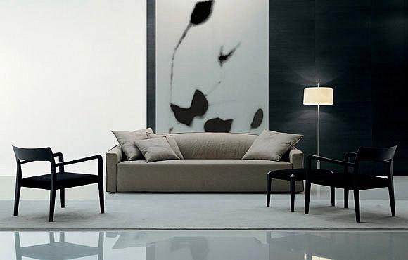 The Atollo sofa (sofa) from the Italian manufacturer Polifоrm. The sofa under the cushion of the backrest. The frame is made of wood, legs made of plastic. The filler is polyurethane foam different densities and polyester fiber. For pillows is filled with fluff and cotton. Removable fabric upholstery, fixed leather version. This series also presents the chair.