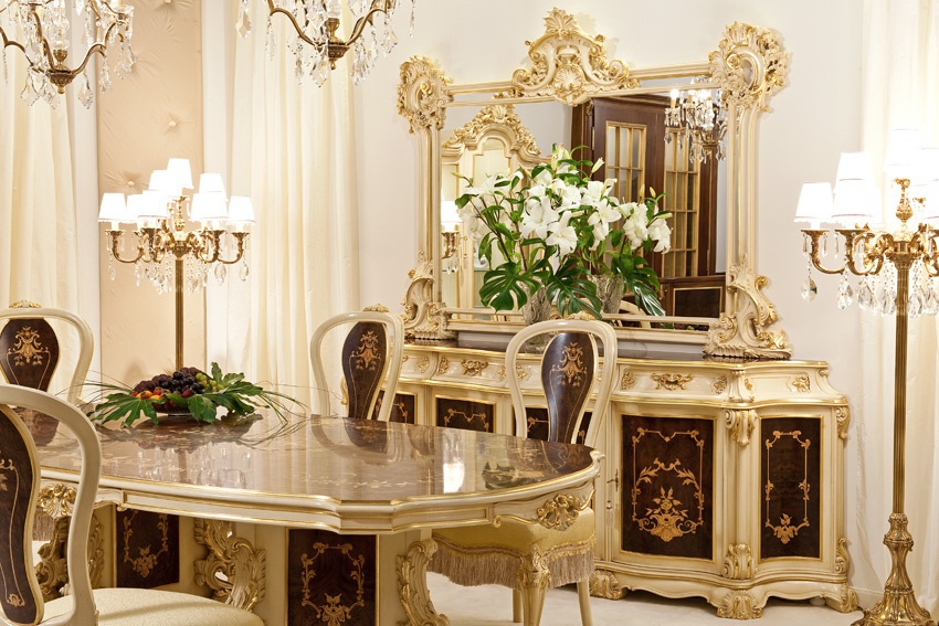 Set for the dining room by Italian manufacturer Fratelli Radice. Oval table with 2 carved legs, top is inlaid with gold inserts, mirror frame carved, chairs with or without armrests, upholstered seat and inlay on the back of the backrest, buffet 4-door. Frame - solid wood. The lacquer finish ivory. Decorative elements in gilt.