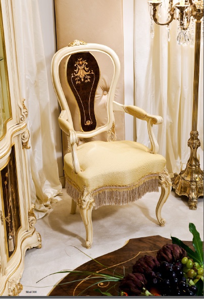 | Description: | Chair with armrests, upholstered seat, rear inlay on the back. Frame - solid wood. The lacquer finish ivory. Decorative elements in gilt. Finish as in the photo. |