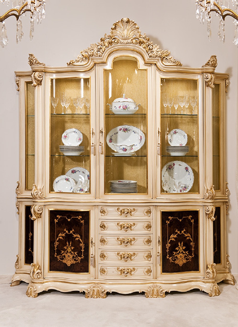| Description: | The sideboard has 3 doors and 5 drawers. The frame is solid wood with hand carved inlaid with gold inserts. The back wall showcases in the tissue. Interior lights. Finish as in the photo. |