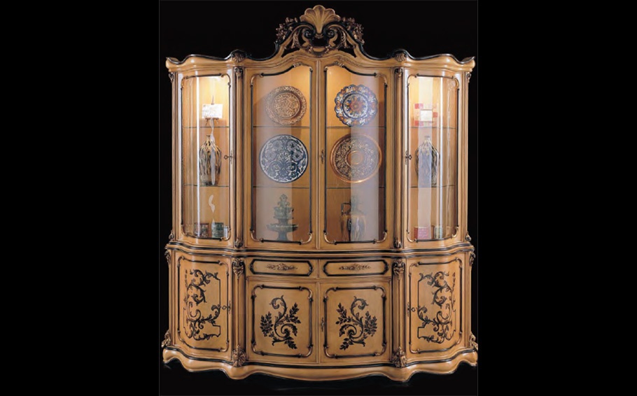 Showcase for crockery-4-door from the Italian manufacturer Fratelli Radice. The frame is solid walnut with hand carved. Florentine painting. The doors are adorned with decorative pattern. Model with internal lighting. Finish as in the photo.