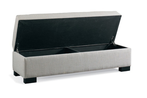 The couch is from an American manufacturer Precedent. A small upholstered couch without a head rest designed in modern style. The rectangular frame and stable feet the couch is made of wood in black color, textile upholstery, light gray tone blends in with any interior. The design of the couch under the seat provides two easily accessible drawers for storage, making it indispensable in a bedroom or dressing room. The company Precedent has combined talent, experience and skill of its employees to create excellent products that decorate Your home.