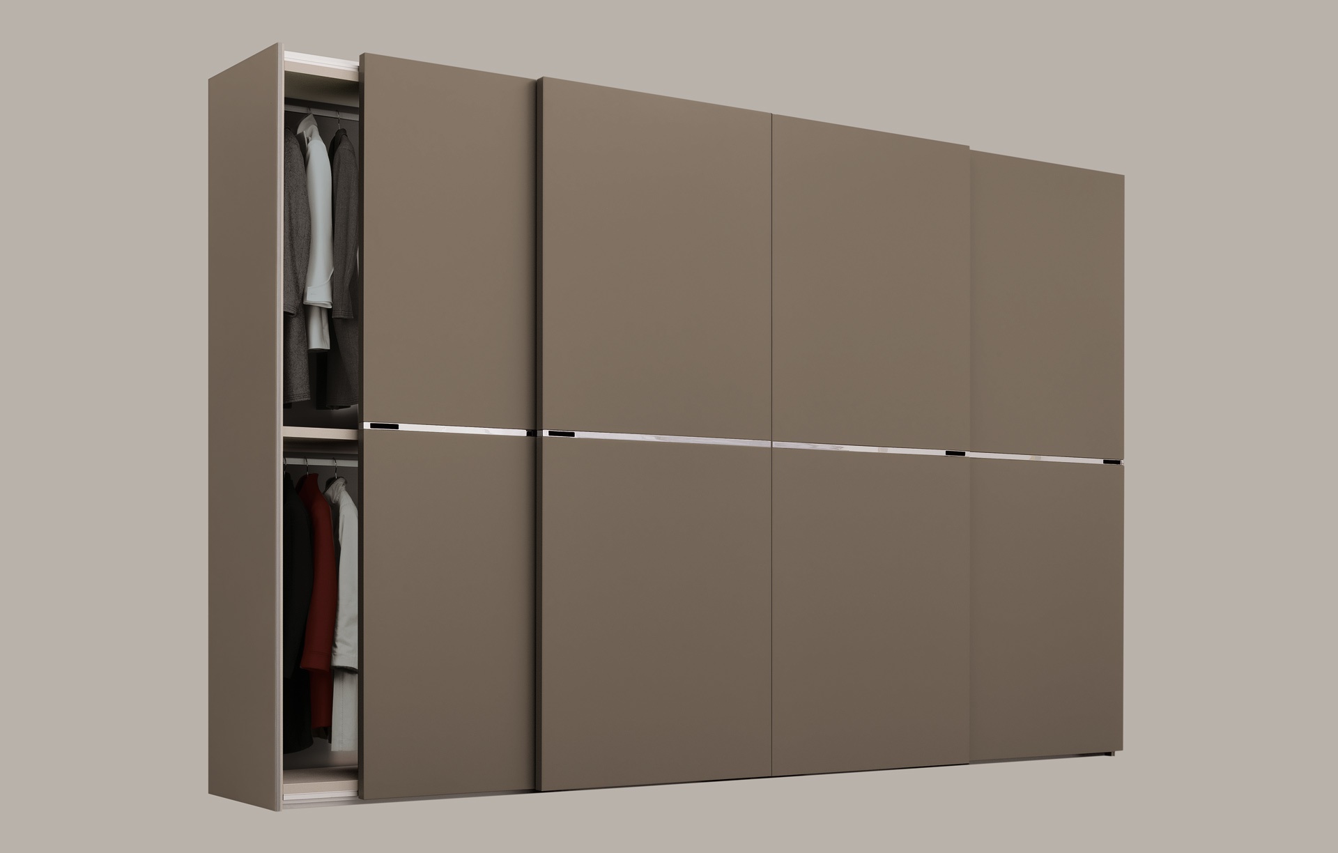 Bangkok dressing from Italian manufacturer Poliform. Wardrobe with sliding doors. Finish options: matte lacquered oak, Matt lacquer finish in various shades from the collection company (does not close the pores of the wood). Finish options frame: Matt lacquer of various shades, oak, wenge, Matt lacquer finish in various shades, American walnut.