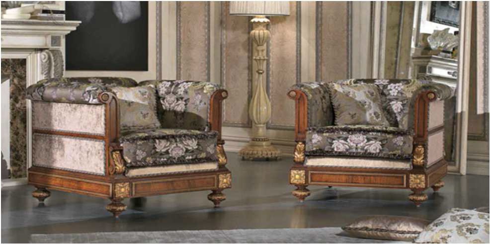 Sofa set from the Italian manufacturer Bianchini. Includes coffee table,three seater sofa and 2 armchairs. The frames are made from beech and solid. Upholstery textile. Filler - polyurethane foam of different densities. Decoration is the decorative carving handmade.