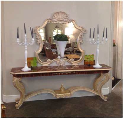 | Description: | The console on high legs from the Italian manufacturer Bianchini. Model made of solid wood. Finish - NOD (carved elements covered with gold leaf and patinated ivory in color). Tabletop of rosewood, inlaid. |