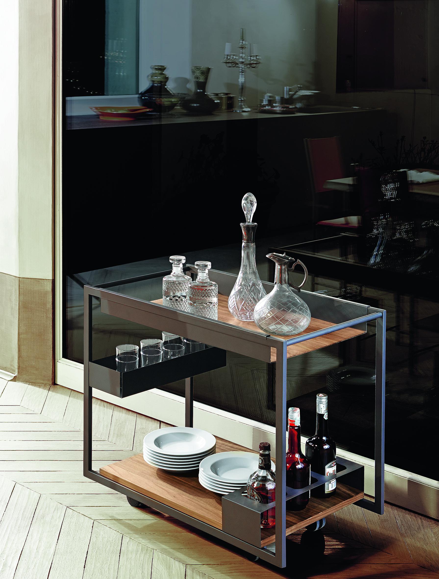 Mojito Wood serving table from Italian manufacturer Cattelan Italia. Made with a frame made of metal on wheels. Tops with upper and lower plane of Canaletto walnut. Color in stock.