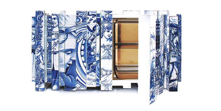 The Standard Blue Heritage sideboard from Portuguese manufacturer Boca Do Lobo. The model with one door and 4 drawers. The body of the array. Finish offered tiles with hand painted and gold leaf. Shelf made of bronze glass. Is characterized by gracefulness and elegance.