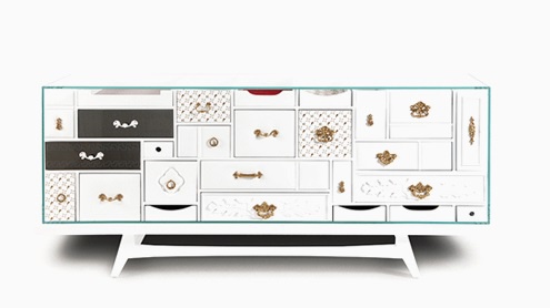 The Mondrian sideboard from Portuguese manufacturer Boca Do Lobo. The frame is made from solid wood and tempered glass. The finish offers a glossy lacquer in black or white. Decoration is the decorative carving handmade.