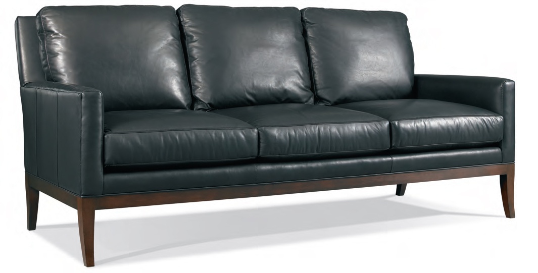 Three-seater sofa from the American manufacturer Whittemore-Sherrill. Designer leather sofa classic proportions decorate the interior of any living room, study or library, everywhere will look appropriate and will ensure You a comfortable stay. Frame and saber legs made of mahogany wood in dark brown color. The soft armrests, the backrest and seat formed by the three cushions with extra volume; upholstery leather of black color. Any product from the company portfolio Whittemore-Sherrill has an additional option - on customer request finish decorative nails Your chosen sample.