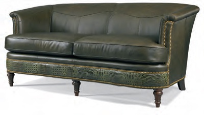 Three-seater sofa from the American manufacturer Whittemore-Sherrill. Soft leather sofa in the English style to decorate the interior of any room, office or library. The model is made in the best traditions of a series of sofas Cambridge. The frame and carved legs are mahogany brown in color. Soft back smoothly into the slightly bent armrests, a seat formed by two pillows with extra volume; upholstery - leather bottle green. The bottom of the sofa is decorated with a reptile skin. Contour upholstery nails French natural sample. The sofa is complemented by two standard pillows and one pillow under the lower back, upholstery textile, with a contrast print.