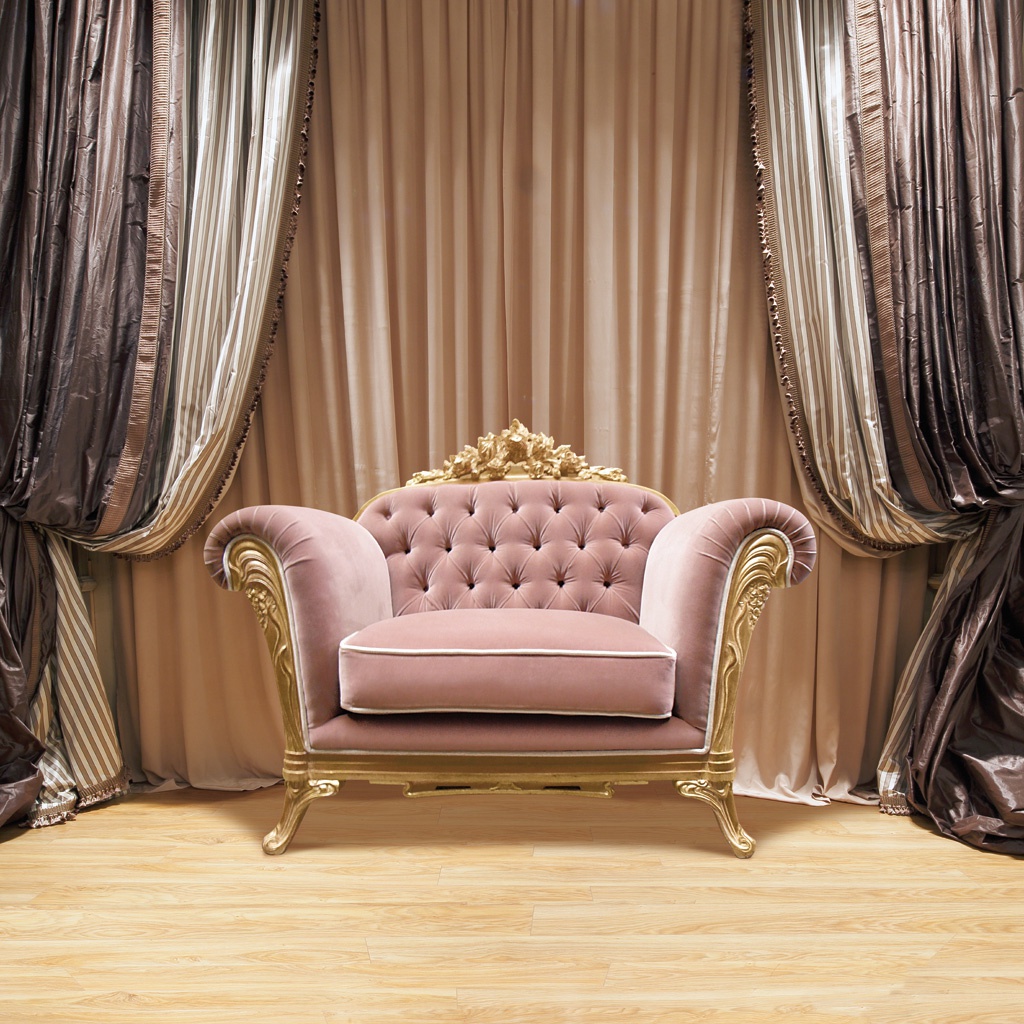 | Description: | The Prestige armchair from Italian manufacturer Medea. Frame - wood. The back is quilted. A distinctive feature is the wooden frame with carved decoration and gilding. Filler - polyurethane foam. Upholstery - cloth. |