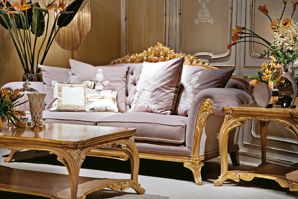 The Prestige sofa from Italian manufacturer Medea. The frame is made from wood. The back is quilted. A distinctive feature is the wooden frame with carved decoration and gilding. Filler - polyurethane foam. Textile upholstery is offered from the company portfolio. The model is made in classic style.