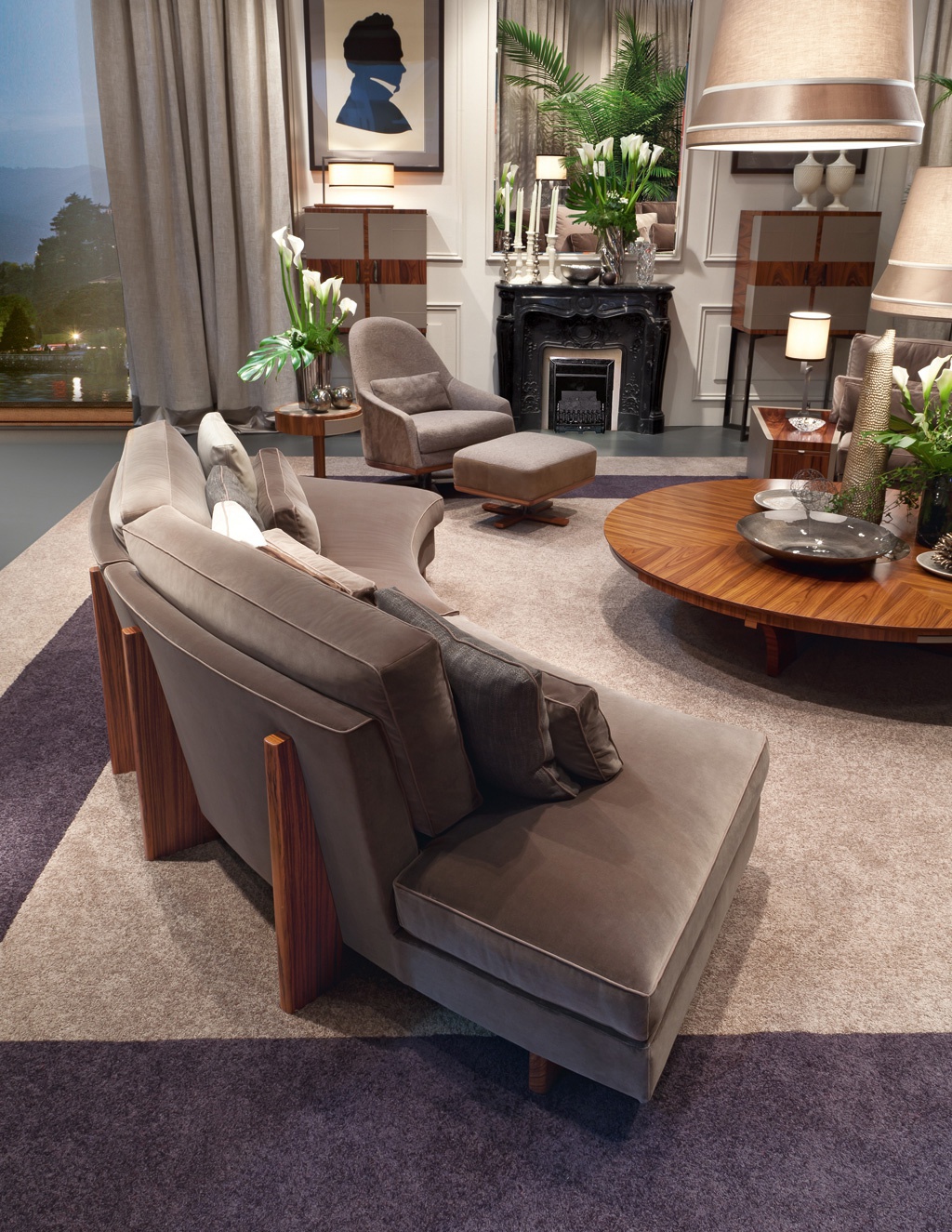 The Maxim sofa from Italian manufacturer Mobilidea. A semi-circular pattern with a low back. The frame is made from wood. The upholstery is made of textile fabric from the company portfolio. Filler - polyurethane foam. The design is executed in art Deco style.
