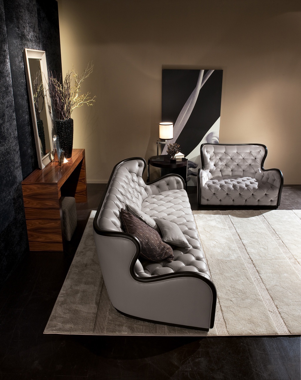 The Margot sofa from Italian manufacturer Mobilidea. Triple model with quilted leather upholstery. Filler - polyurethane foam. The frame is made of wood. Design in art Deco style.