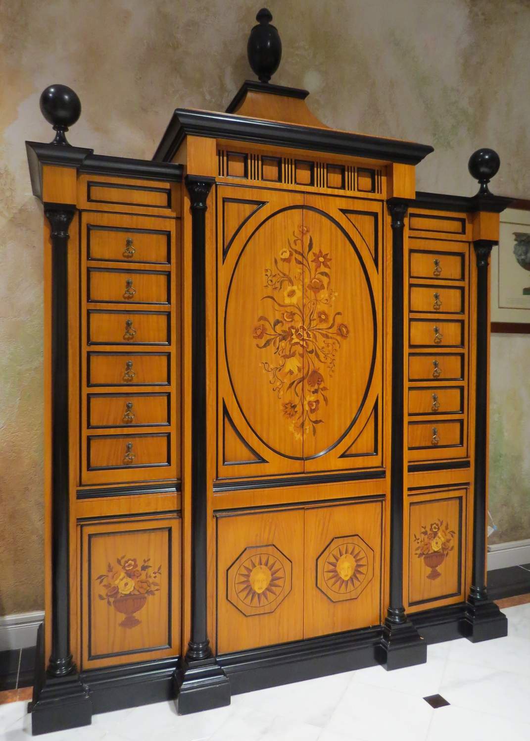 Bookshelf from Italian manufacturer Francesco Molon. The model is made in classic style of natural wood decor - carved elements. Finish - black lacquer, inlaid. (02 Burl w/ Black/No Distressing, Semi-Shiny)